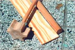4. Do obou konců zbylé tyčky z kvedlačky vyhloubíme nožem drážku širokou asi 2,5 cm a hlubokou 1 - 2 mm. Potom tyčku provlečeme středem mlýnku.