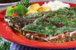 Rozmrazíme špenát a přidáme do něj ostatní ingredience tak, aby vznikla konzistence těsta jako na bramboráky. Pečeme větší placky z obou stran. Po upečení je na jedné straně namažeme kečupem, posypeme sýrem a zabalíme. Podáváme teplé nebo studené.