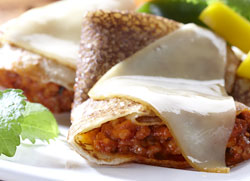 Masová náplň: Česnek prolisujeme, žampiony oloupeme a jemně nasekáme. Na pánvi rozpálíme olej, orestujeme maso, pak vmícháme žampiony, tavený sýr, česnek, bylinky, rajčatový protlak a ještě chvilku restujeme. Podle chuti osolíme a opepříme. Palačinky plníme masovou směsí, složíme do "psaníčka", aby náplň nevytekla, vložíme do pekáčku. Poklademe eidamem a v předehřáté troubě zapečeme dorůžova. Zdobíme barevnými paprikami.
