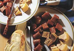 Keramický rendlík vytřeme česnekem, aby pokrm získal příznačnou vůni. Nakrájíme 400 g ementálu na drobné kousky. Rendlík postavíme na oheň a vlijeme do něj 2 sklenky bílého vína. Vsypeme půl lžičky mletého bílého pepře a špetku strouhaného muškátového oříšku. Když víno začne vřít, přidáme ementál a stále mícháme. Odstavíme rendlík a v troše vína rozpustíme lžičku škrobu. Smícháme se sýrem a opět postavíme na oheň. Přilijeme sklenku vodky nebo višňovice a šleháme dál.