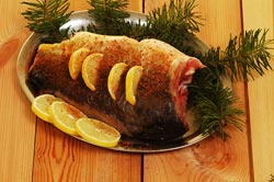 Dvě větší porce očištěného kapra uvaříme ve slaném odvaru s kořenovou zeleninou. Necháme vychladnout, maso oddělíme od kostí, zbavíme kůže a krájíme na větší kostky. Ihned pokapeme citrónovou šťávou. Maso necháme odležet a poté promícháme se smetanou a jogurtem. Přimícháme syrovou mrkev nebo křen a nasekanou petrželovou nať. Jako přílohu podáváme černý chléb nebo tmavou bagetu.