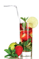 4 dl bílého rumu, 5 lžiček třtinového cukru, 1 limetky, 5 cl limetového sirupu, soda, 5 lístků máty, 3 jahody
